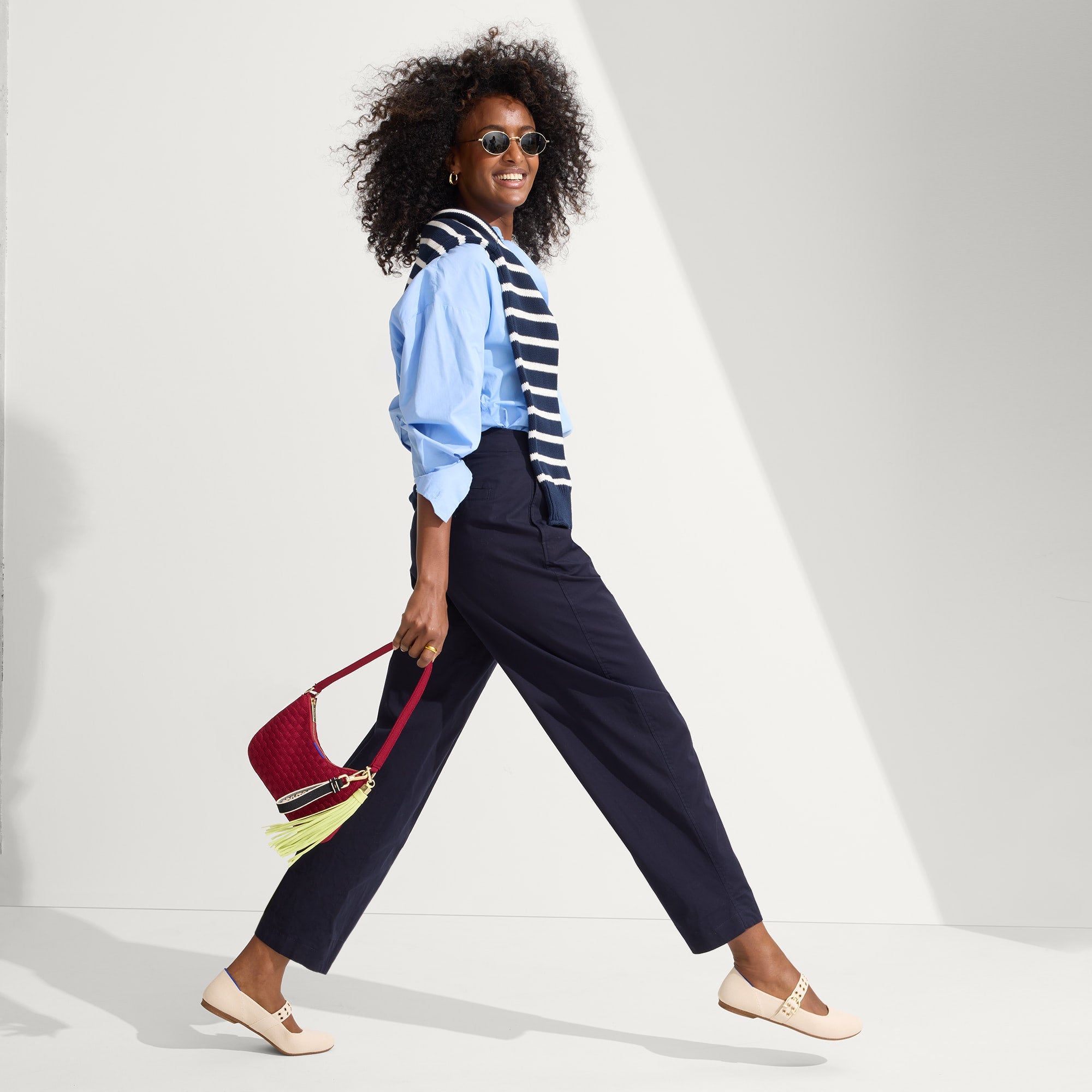 - Adjustable signature straps with gold metal eyelets for style with a bit of edge.