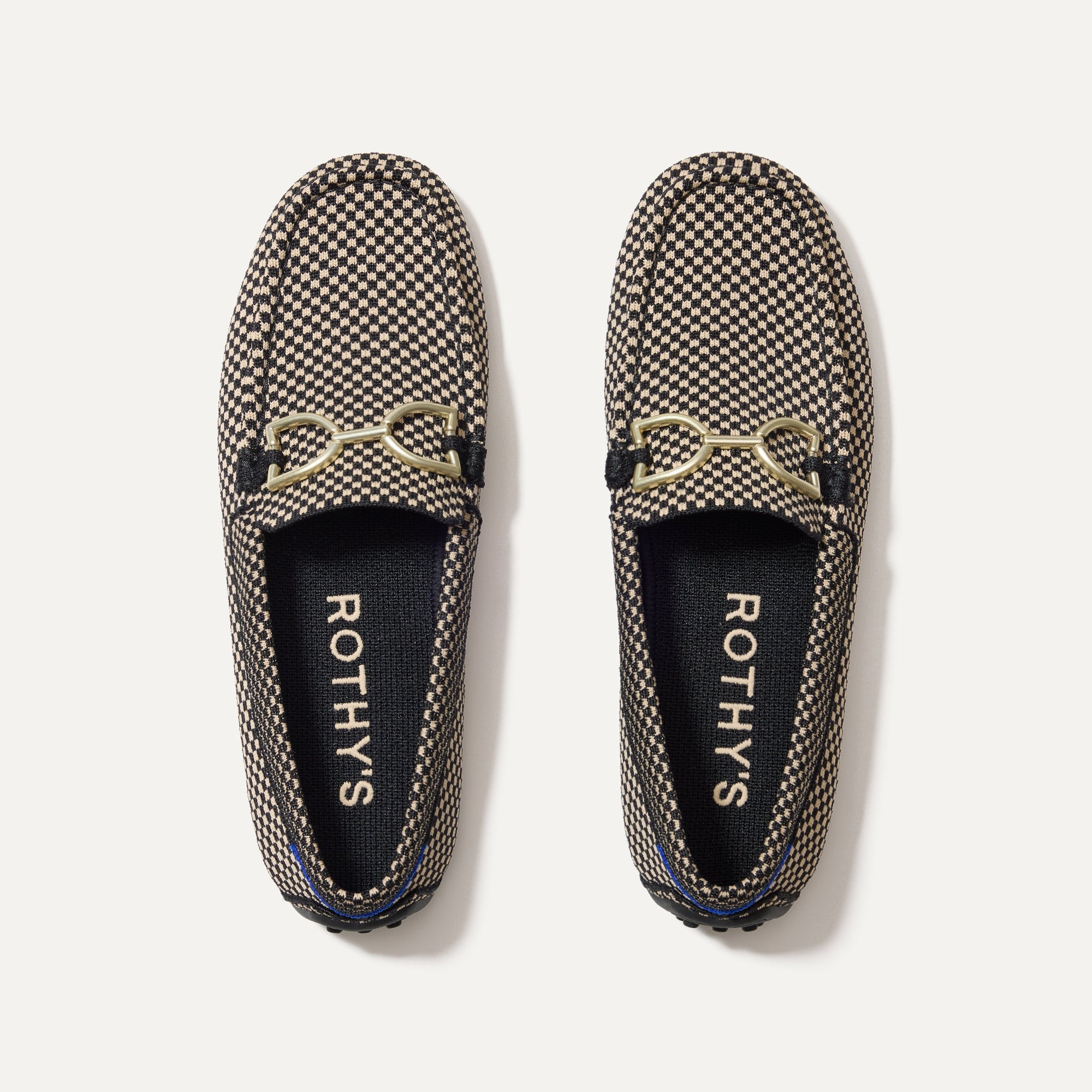 - Soft. flexible upper in an ivory and black micro checkered pattern with a gold hardware signet bit on the vamp.