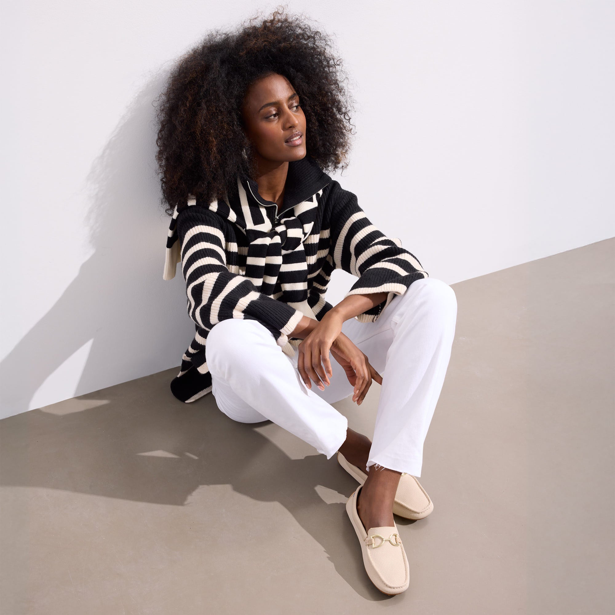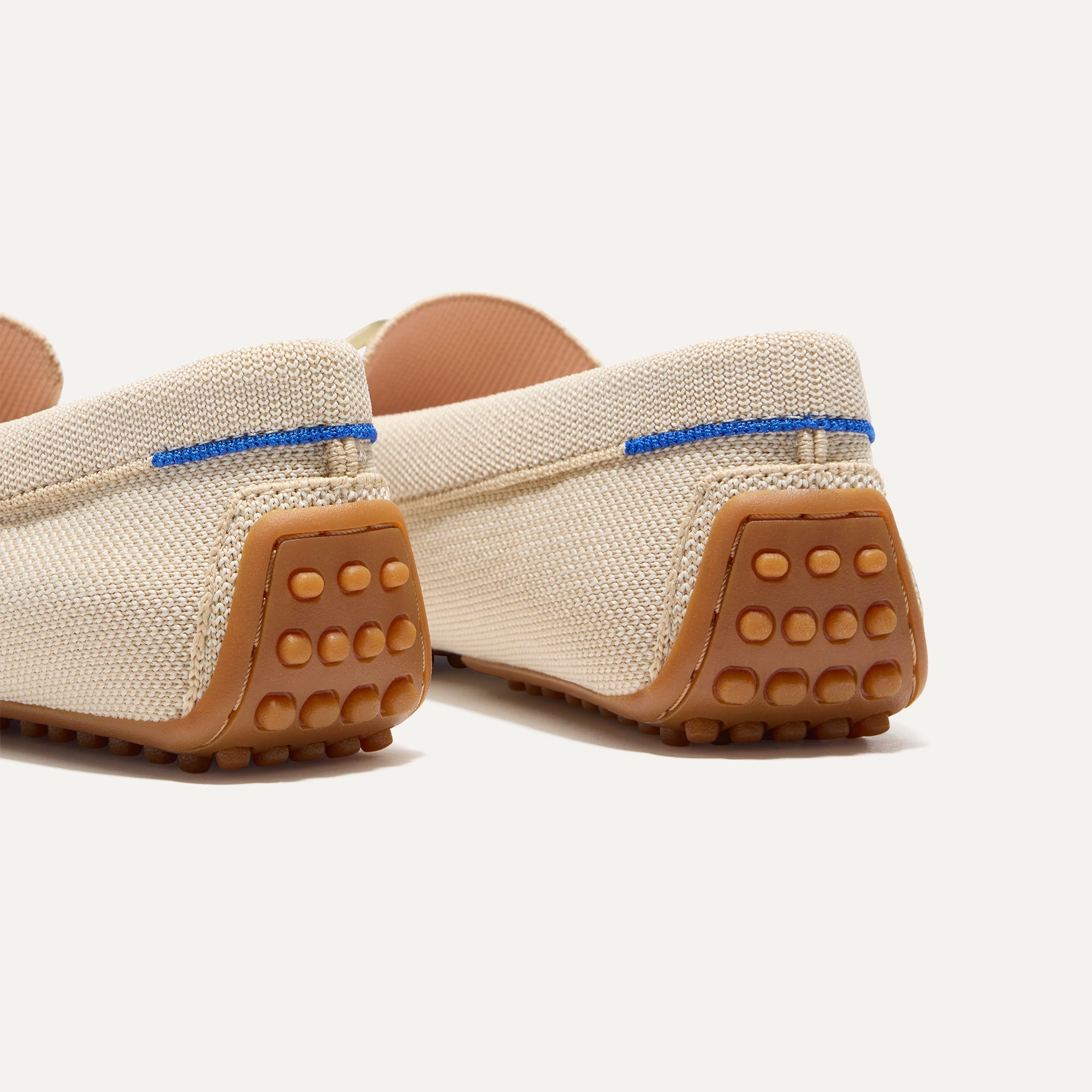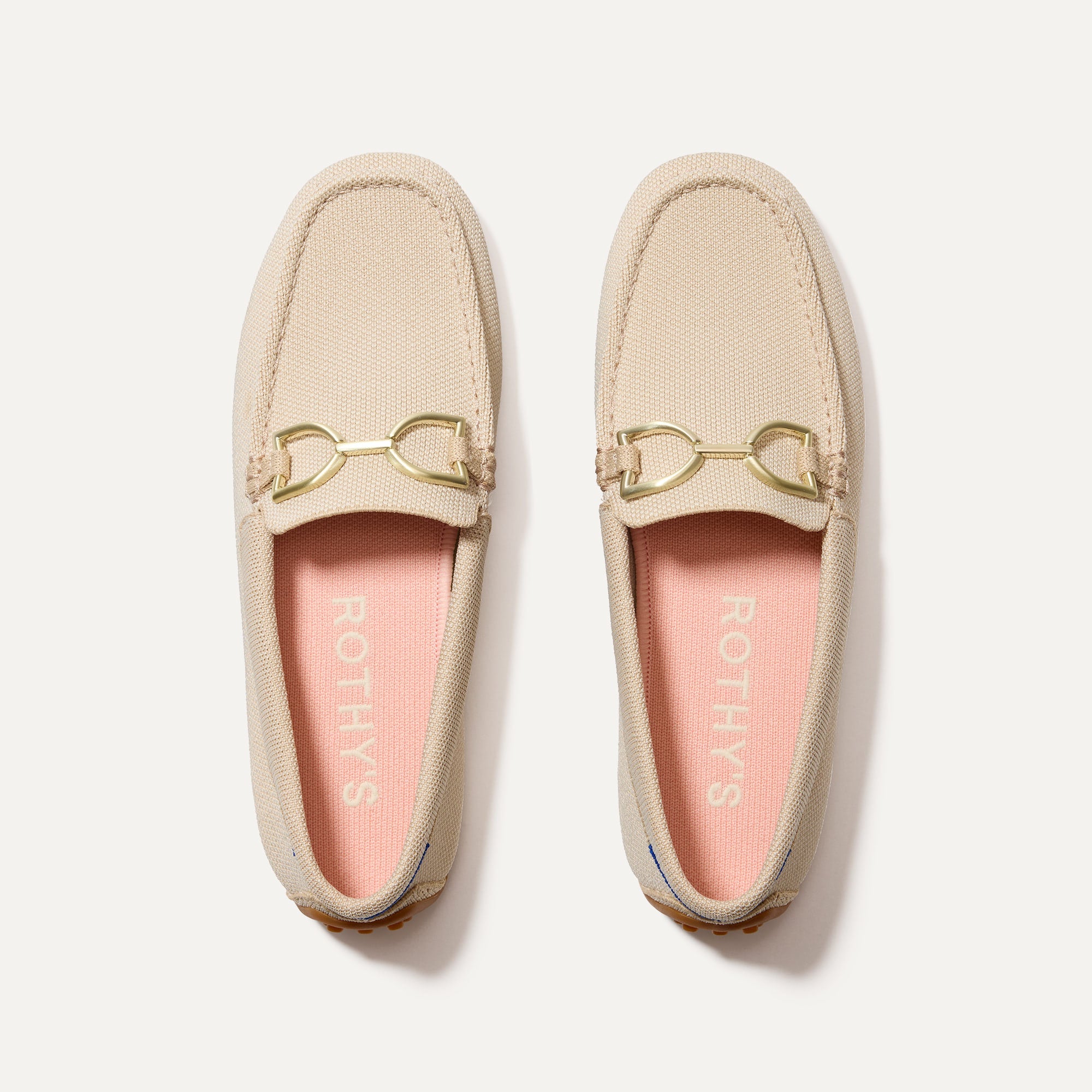 - Soft. flexible upper in light sesame with a gold hardware signet bit on the vamp.