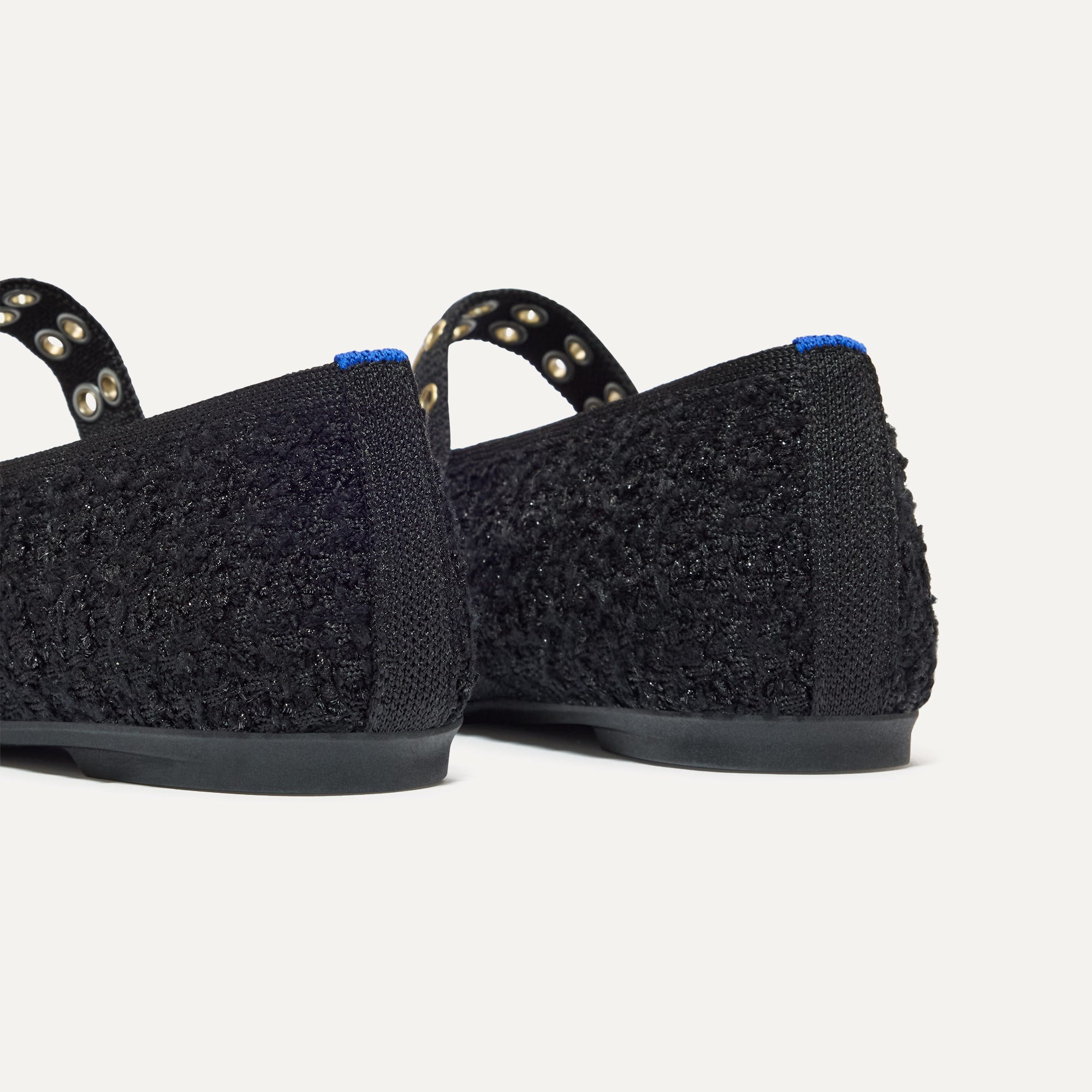 - Knit boucl?? upper in shimmery black with a square toe box and a sharp V-shaped vamp.