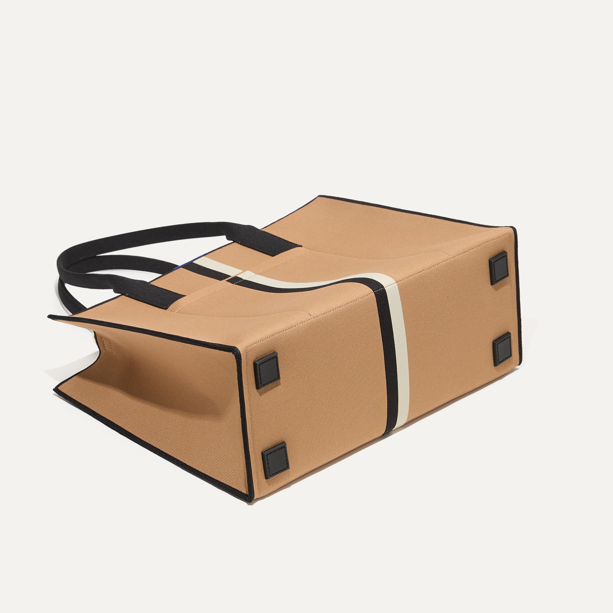 - Boxy. lightweight design in light camel with two center stripes in black and ivory. and a secure zipper closure.