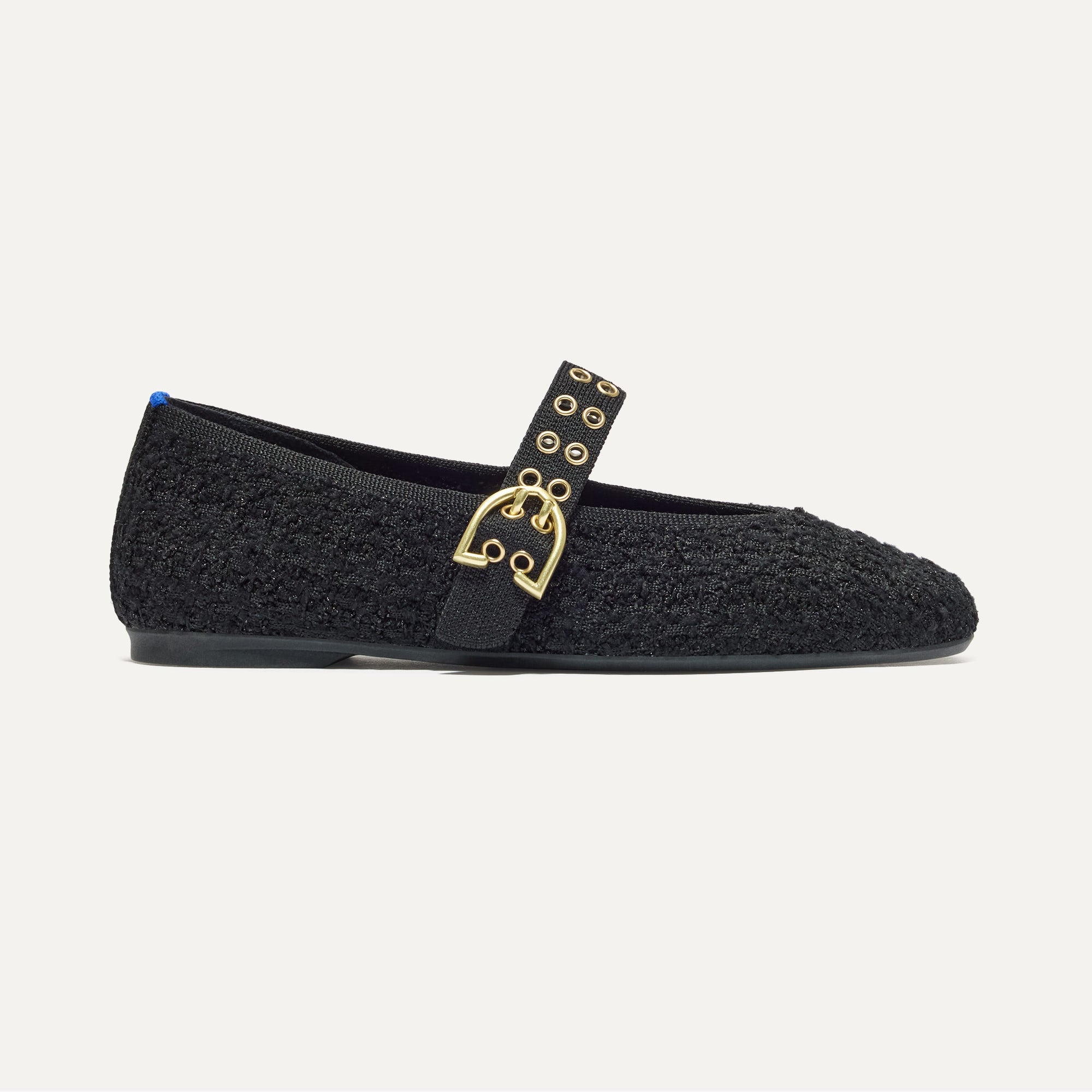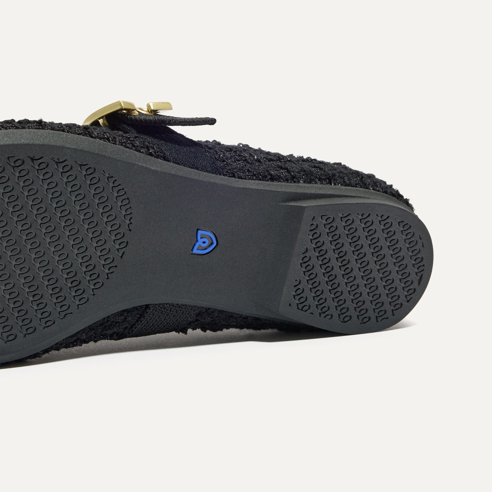 - Knit boucl?? upper in shimmery black with a square toe box and a sharp V-shaped vamp.
